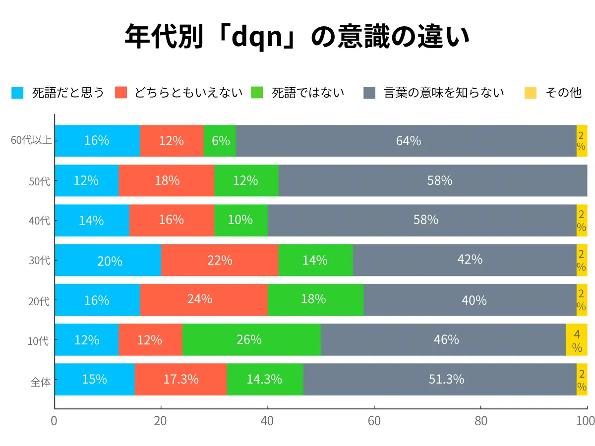 「DQN」の年代別の意識をグラフにした結果、全世代的に言葉の意味が浸透していないということが分かりました。
