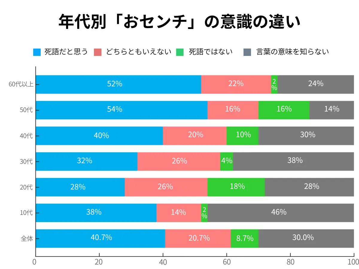 「おセンチ」の年代別の意識をグラフにした結果、全世代で「死語ではないと考えている人」はわずかだということが分かりました。